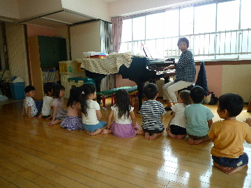 | 月に2回、水曜日にリトミックがあります。 年中、年少組が取り組んでいます。 ボールやフープを使って、楽しく体を動かしていますよ♪ |